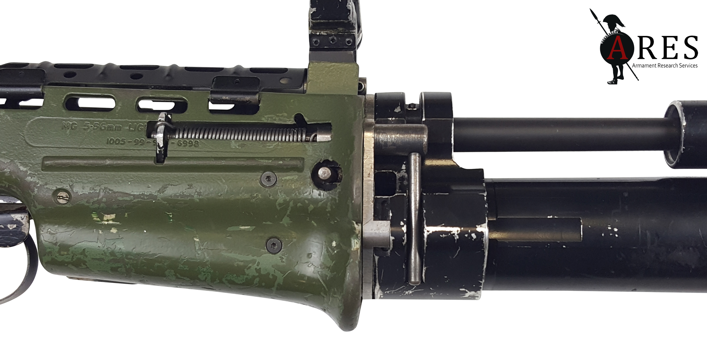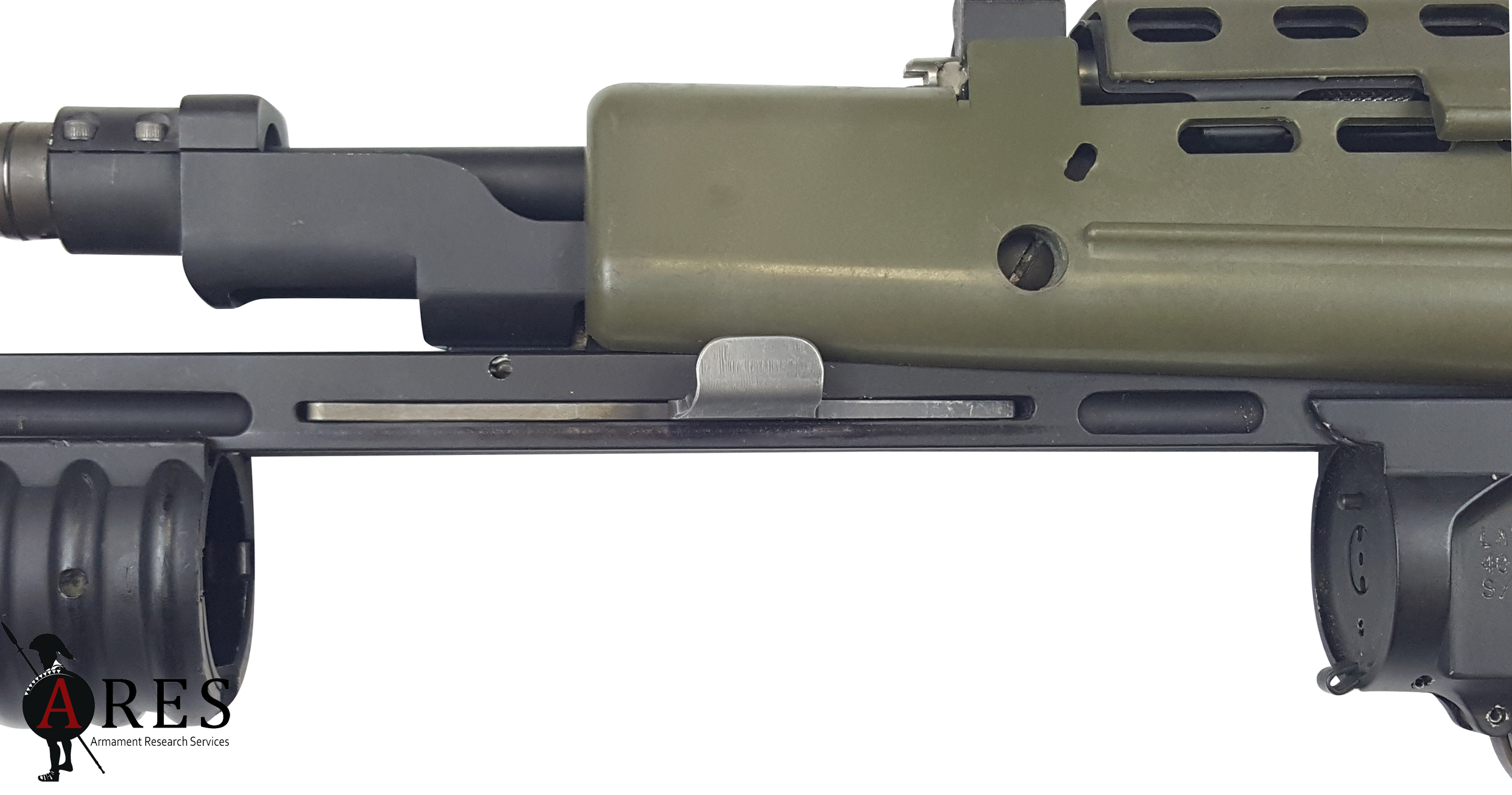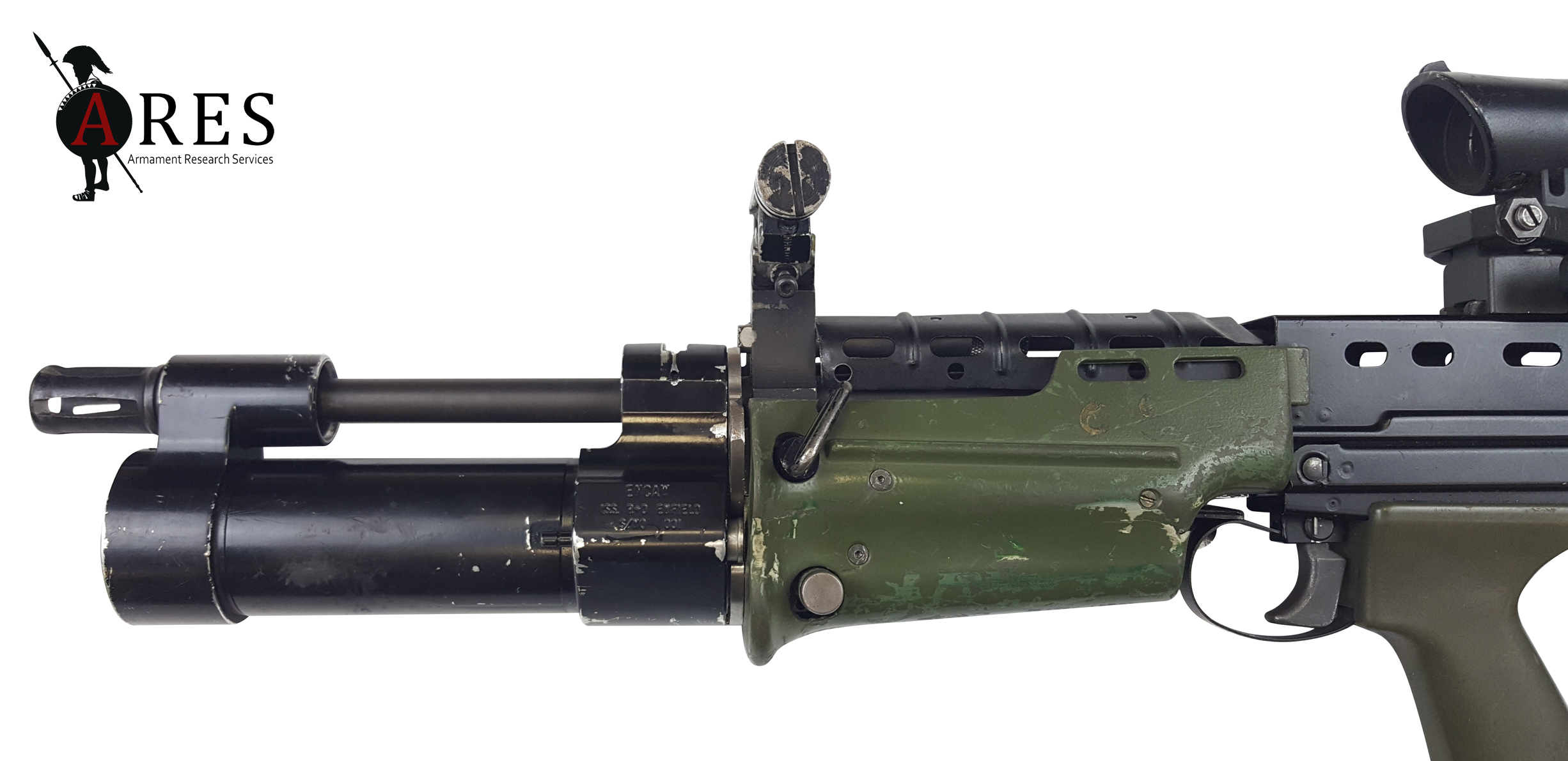 The ENCAW was certainly a novel design, the grenade launcher barrel being sleeved over the rifle’s barrel and encased in an enlarged LSW-style handguard, with the release catch at the rear, just above the trigger guard. At the far end, a substantial barrel support bracket held the GL muzzle to the grenade launching ring on the host rifle’s flash-suppressor. This arrangement was enabled by the unique rotating loading mechanism whereby the launch tube pivoted around the rifle barrel to expose the breech. Like a side-opening design, this theoretically allowed the use of grenade cartridges with a greater overall length than would be compatible with a slide-forward breech design. However, due to the compact design, the barrel’s length was dictated by that of the rifle barrel above, resulting in a barrel which would not be compatible with many longer projectiles. The prototype SUSAT on the weapon was furnished with a folding leaf sight after the fashion of the existing US M79 standalone launcher. In this prototype form the launcher was bolted in place around the barrel and onto the front of the Body (upper receiver).