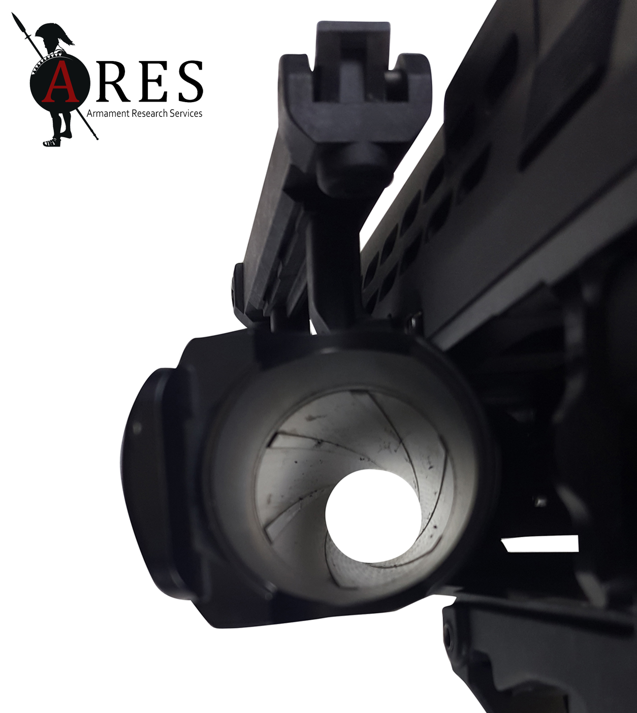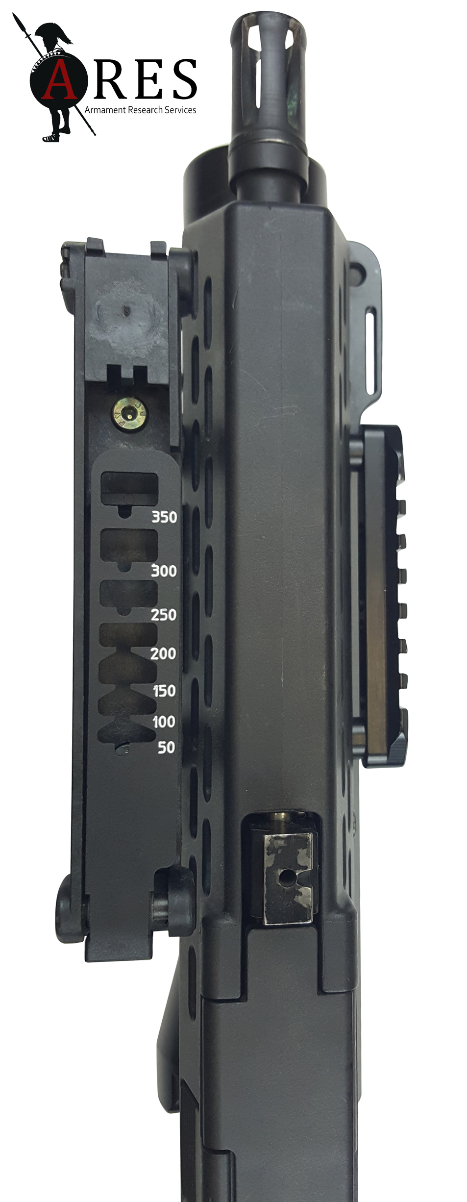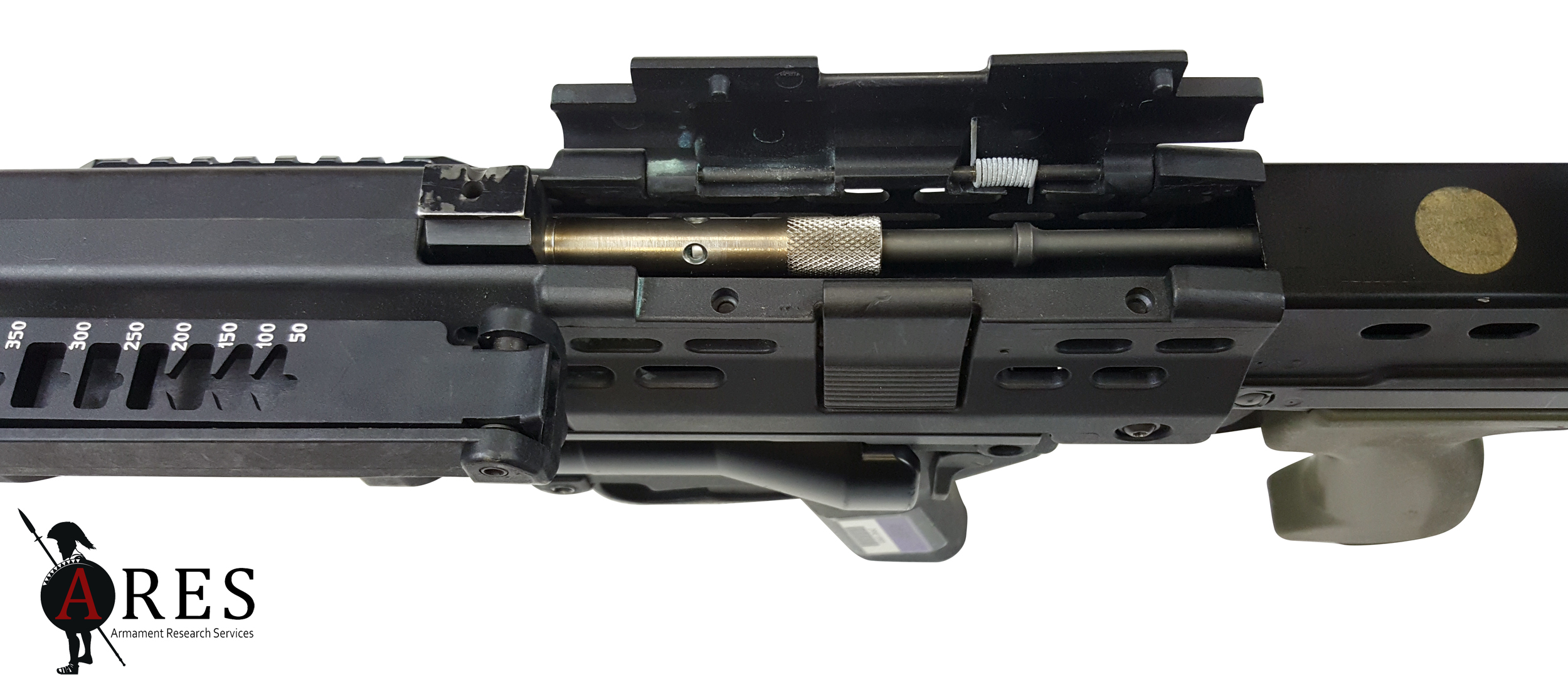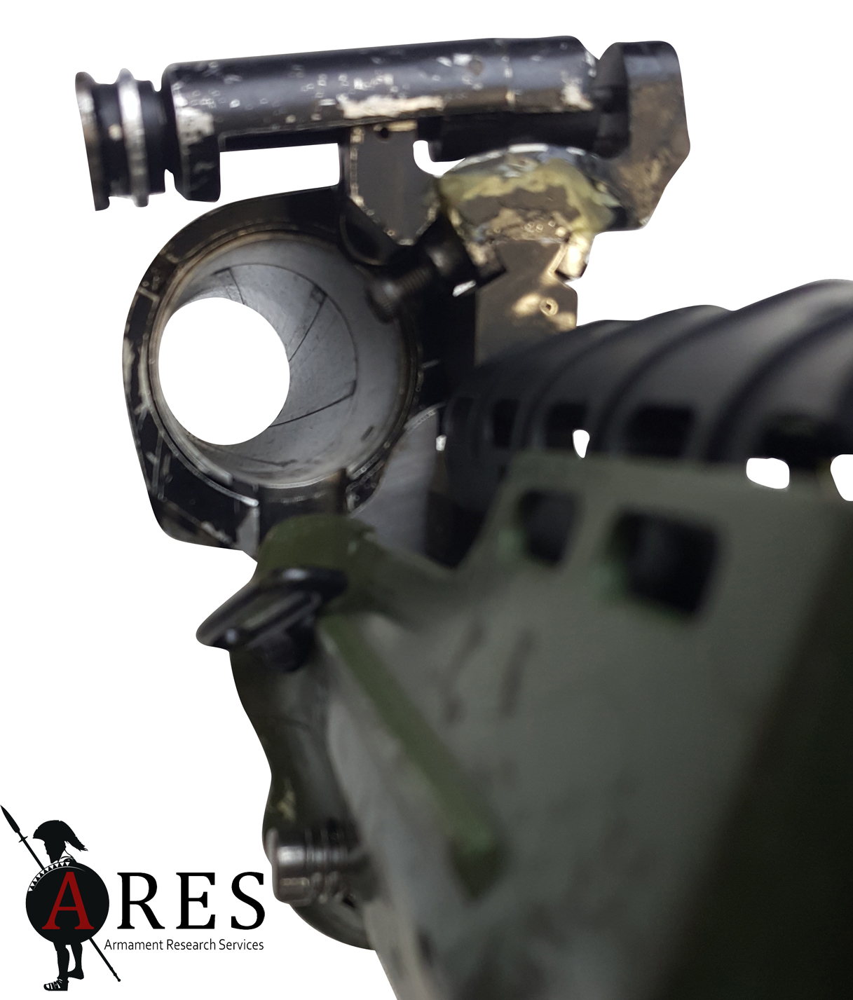 The ENCAW was certainly a novel design, the grenade launcher barrel being sleeved over the rifle’s barrel and encased in an enlarged LSW-style handguard, with the release catch at the rear, just above the trigger guard. At the far end, a substantial barrel support bracket held the GL muzzle to the grenade launching ring on the host rifle’s flash-suppressor. This arrangement was enabled by the unique rotating loading mechanism whereby the launch tube pivoted around the rifle barrel to expose the breech. Like a side-opening design, this theoretically allowed the use of grenade cartridges with a greater overall length than would be compatible with a slide-forward breech design. However, due to the compact design, the barrel’s length was dictated by that of the rifle barrel above, resulting in a barrel which would not be compatible with many longer projectiles. The prototype SUSAT on the weapon was furnished with a folding leaf sight after the fashion of the existing US M79 standalone launcher. In this prototype form the launcher was bolted in place around the barrel and onto the front of the Body (upper receiver).